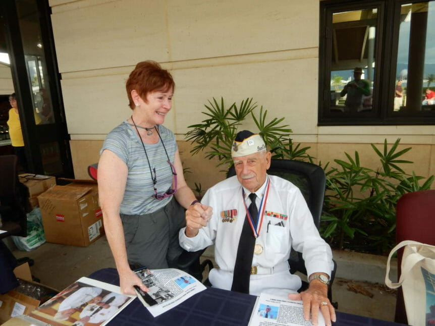 The Museum, the Bowfin, the Missouri, The Arizona … these are highly impactful things for patriotic citizens to experience … for history buffs to see. But for me, nothing compared to meeting Delton E. Walling, CSM, USN. He was quietly sitting outside the Museum, a small display by his side and handouts on the table, having his picture taken with anyone who wished. I wanted to thank him for his service, an effort I make when seeing any Veteran wearing a hat telling us where he or she served. My husband snapped this shot and I’m glad that he did.