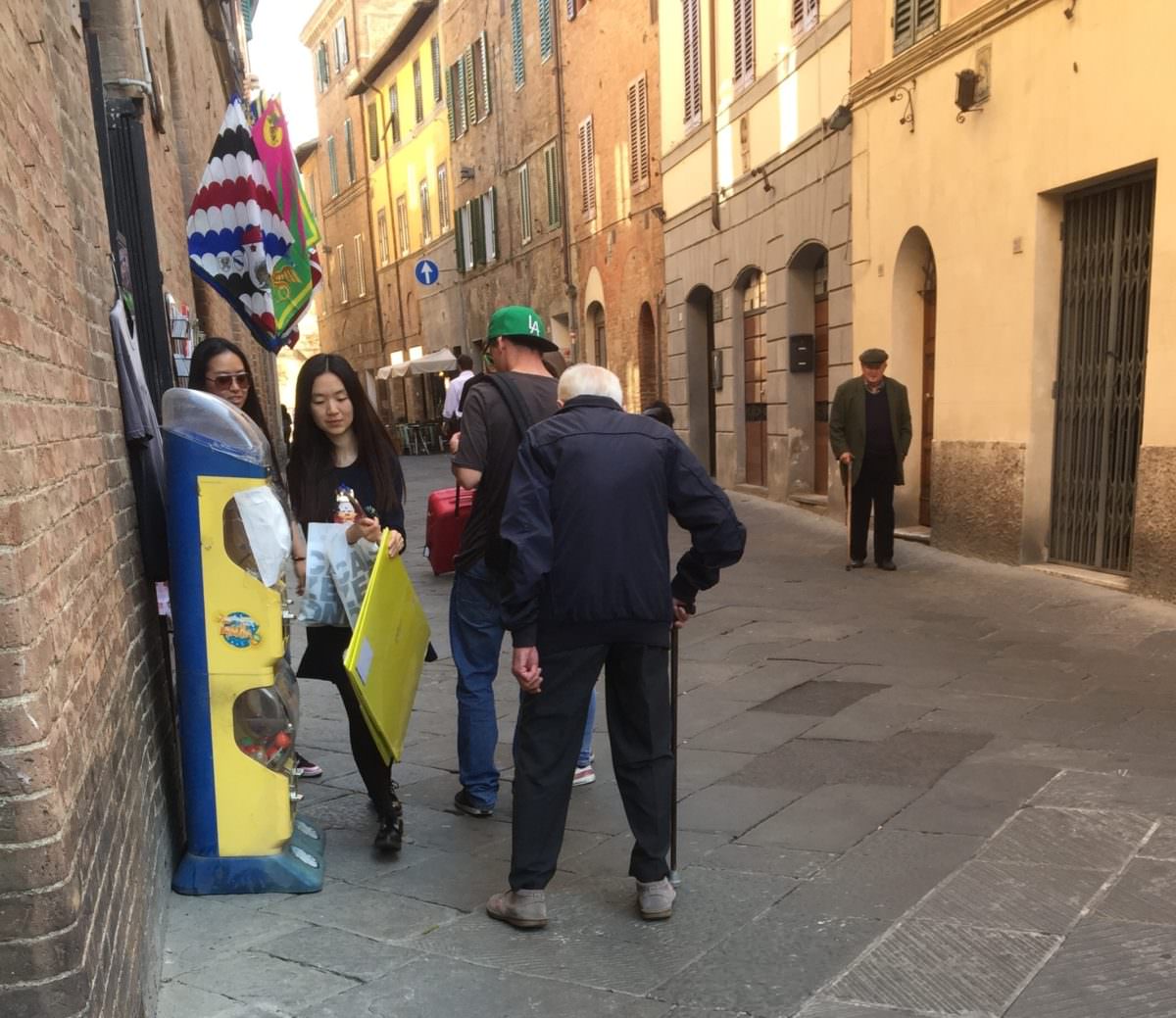 My sister Jackie taught me this during our Cinque Terre trip. Pay attention to the people who live in a place and as often as possible, sneak photographs of them. In Siena, I fell briefly in love with the white-haired woman overlooking the street from her wide balcony. She simply looked down to see what was going on and I saw her, giving her a gentle Buena Sera. Her smile was huge as she Sera’d me back. I gave her a wave, which she returned, and further down the street, I turned to wave again and snuck a photo of her.