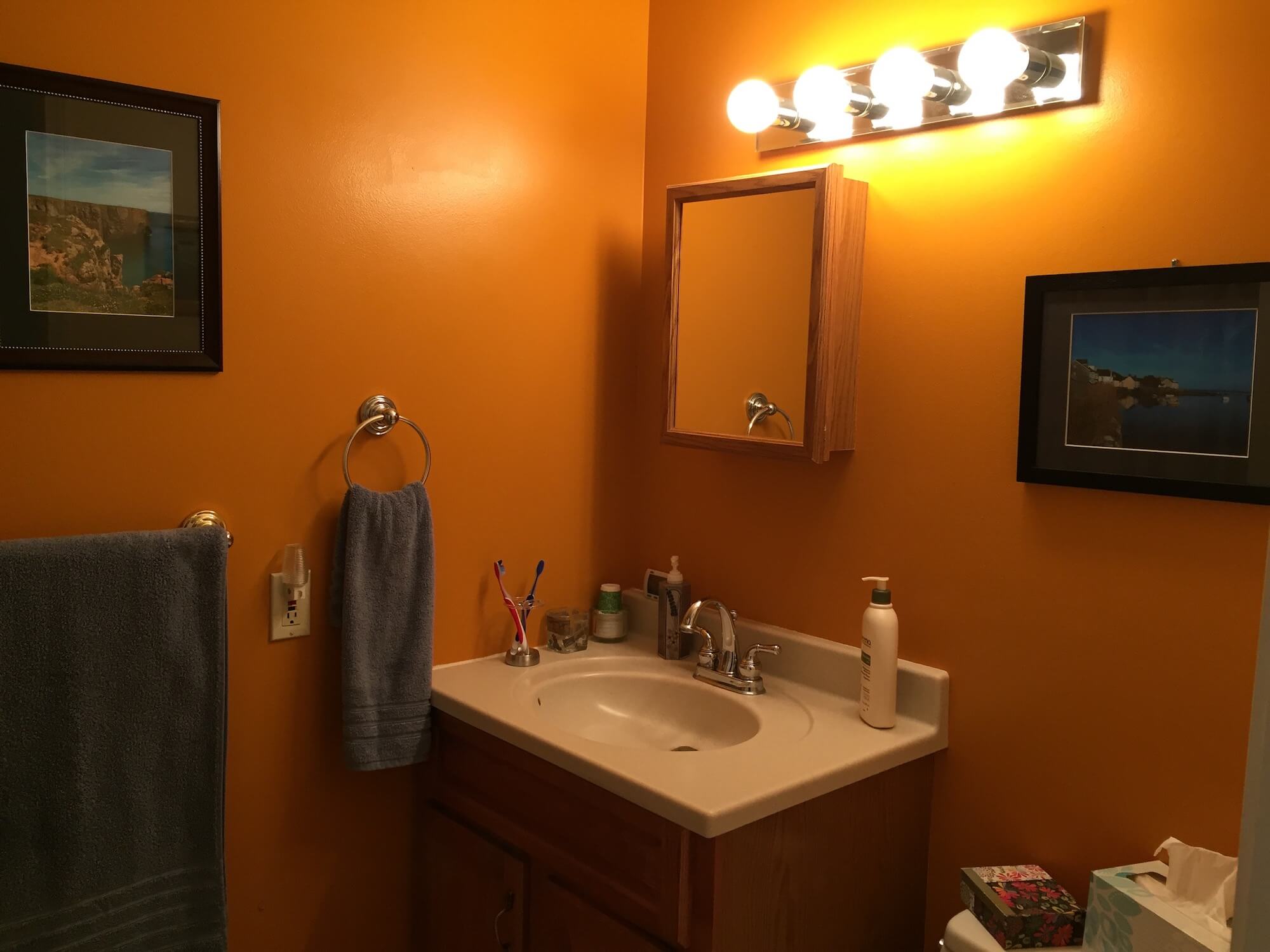 Hence my desire to have a bit of deep Tuscan orange on the bathroom walls to accent the sea-blue photographs of Wales displayed there.
