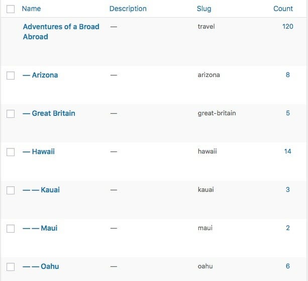 On my site under the main heading of Adventures of a Broad Abroad, are various places I’ve traveled. The hierarchy looks like this: